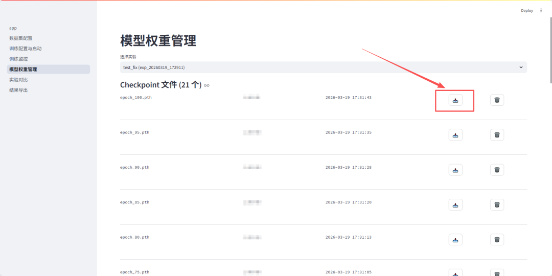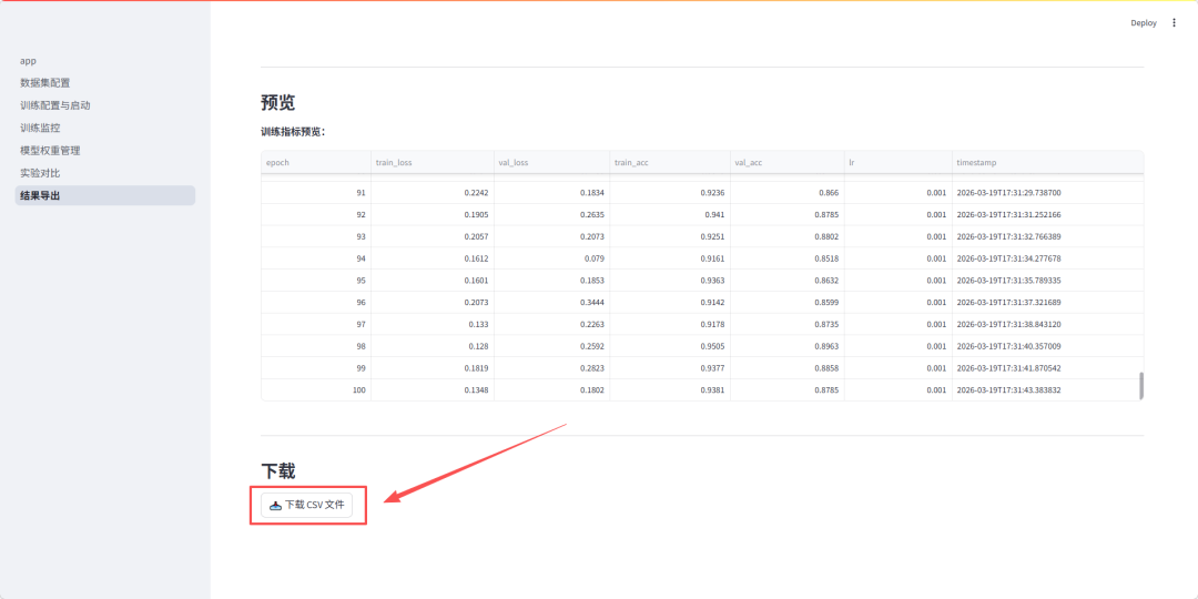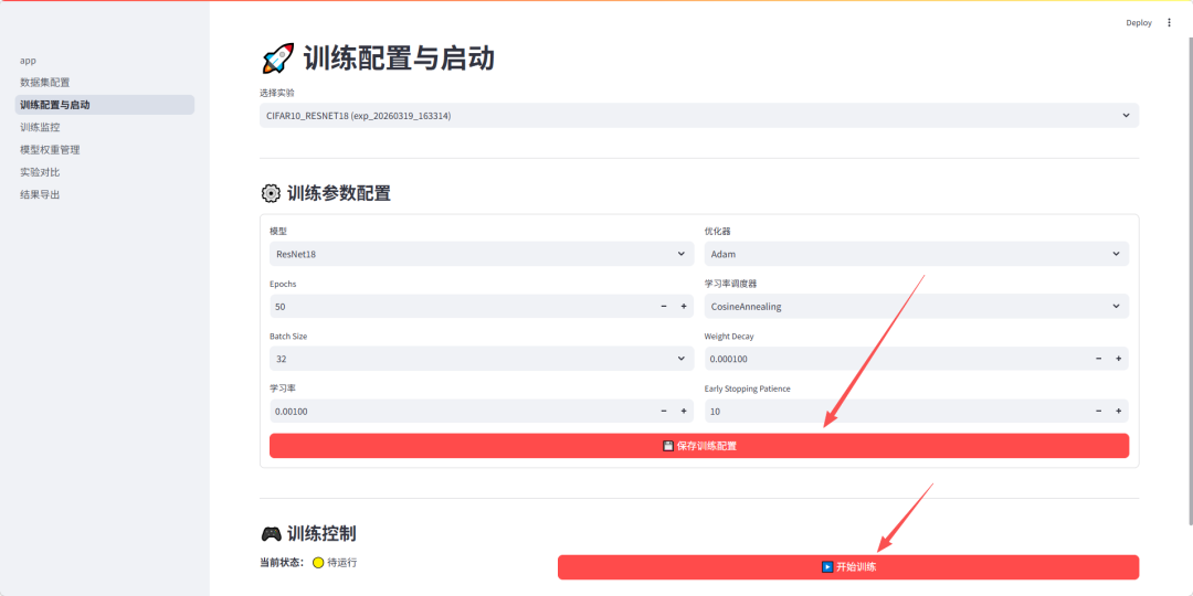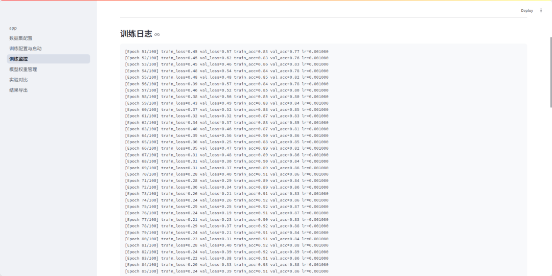 用 Python 做一个深度学习实验管理面板。要支持数据集配置、训练参数编辑、训练日志实时展示、loss/accuracy 曲线可视化、模型权重管理、实验对比,以及训练完成后的结果导出。