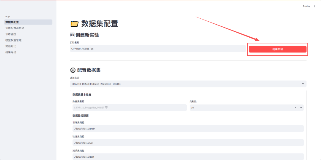 首先我们创建一个实验,配置数据集。例如就创建一个使用 ResNet18 分类模型对 CIFAR10 数据进行分类的实验。