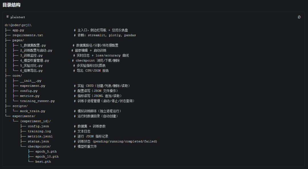 最终,经过几名专家的协同合作,不出 3 分钟,整个深度学习实验管理面板已开发完毕。整个项目结构非常清晰: