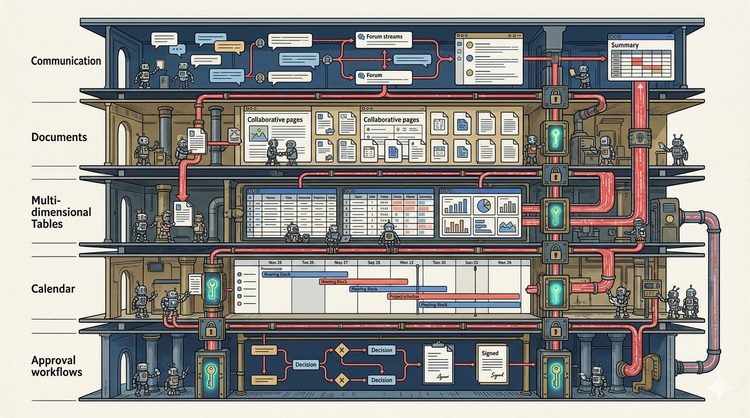 飞书也在往类似的方向探索。Slack的核心是通讯和集成,文档、数据库、项目管理全靠第三方。飞书把通讯、文档、多维表格、审批、日历全做在一个平台里,并提供2500多个标准化API。硅基流动联合创始人杨攀的判断是,飞书不只是IM工具,更是一个完整的workspace平台。这套结构化的工作语义,文档、表格、消息流、审批、日历,组合在一起构成了企业运转的可操作骨架。agent在这样的环境里,不是在调用孤立的工具,而是在操作一个组织的抽象模型。