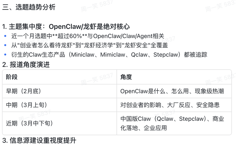 我试了一个任务,让它把近一个月散落在飞书各处的周会文档汇总一下,分析能得出什么结论。这些文档分布在不同的飞书云文档里,有会议纪要、有报题表、有工作汇报,格式和结构各不相同。智能伙伴拉通了这些内容,输出了一份结构清晰的汇总,覆盖了讨论主题的演进趋势、关注重点的变化,甚至指出了工作节奏加密后可能带来的深度不足风险。对一个刚上线的产品来说,这个检索和归纳能力超出了预期。