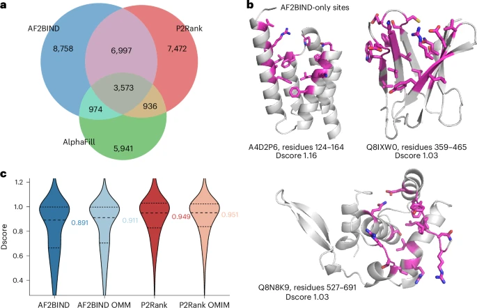 图 4:AF2BIND 预测了人类蛋白质组中未通过同源建模(AlphaFill)或 P2Rank 发现的可药物位点。