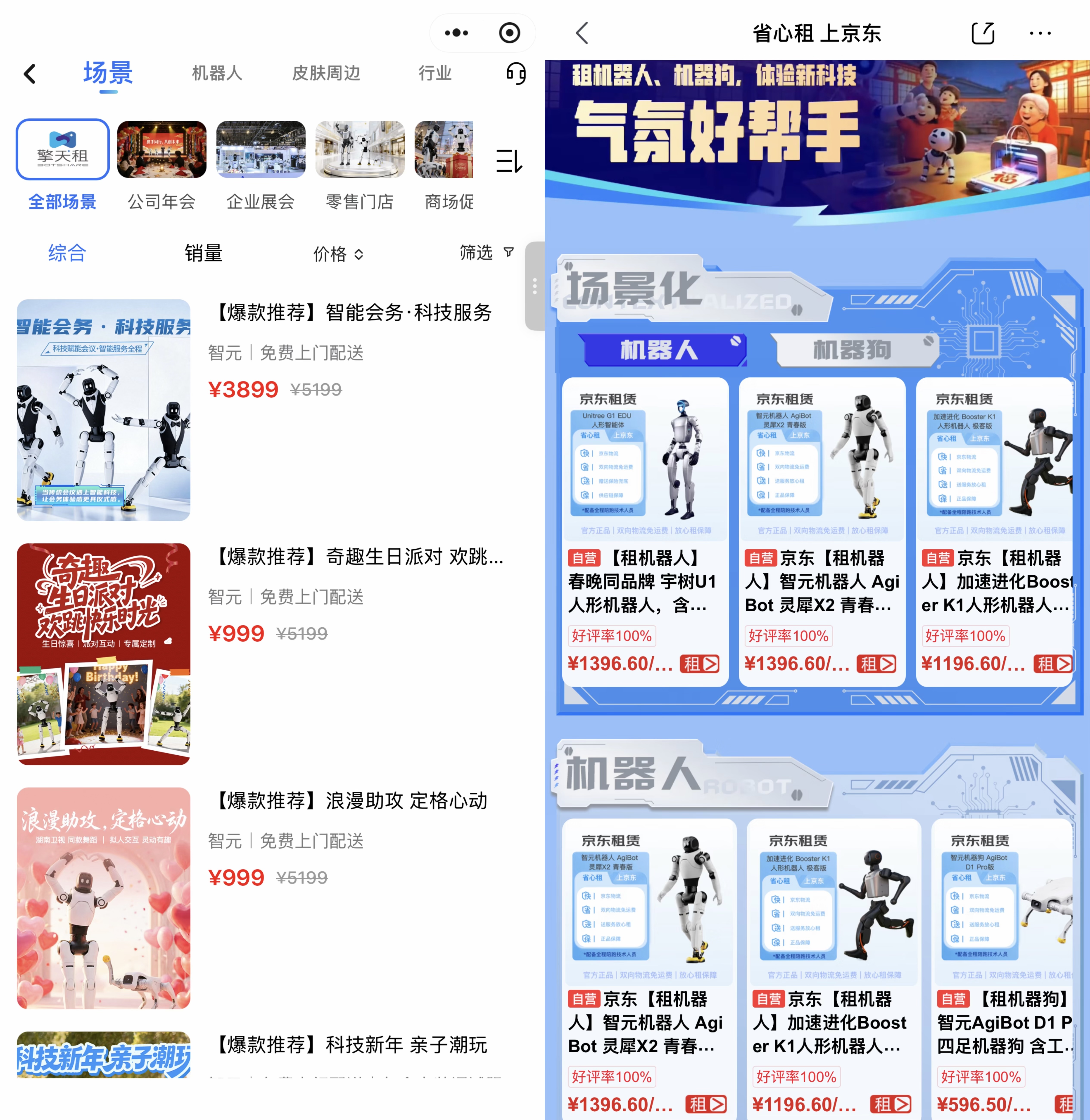 界面新闻记者查阅擎天租平台发现,以生日场景模式打包服务为例,智元灵犀X2叠加服装道具,日租金为999元,包含全程服务。春晚同款宇树U1人形机器人在京东平台日租金为1396元,智元灵犀X2日租金为1396元,均包含上门工程师服务。