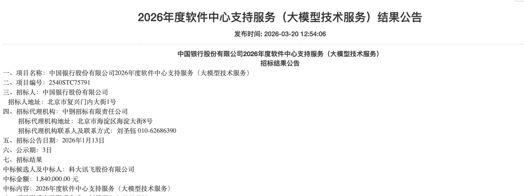 3月20日,中国银行股份有限公司2026年度软件中心支持服务(大模型技术服务)项目开标,科大讯飞股份有限公司中标,金额184万元。