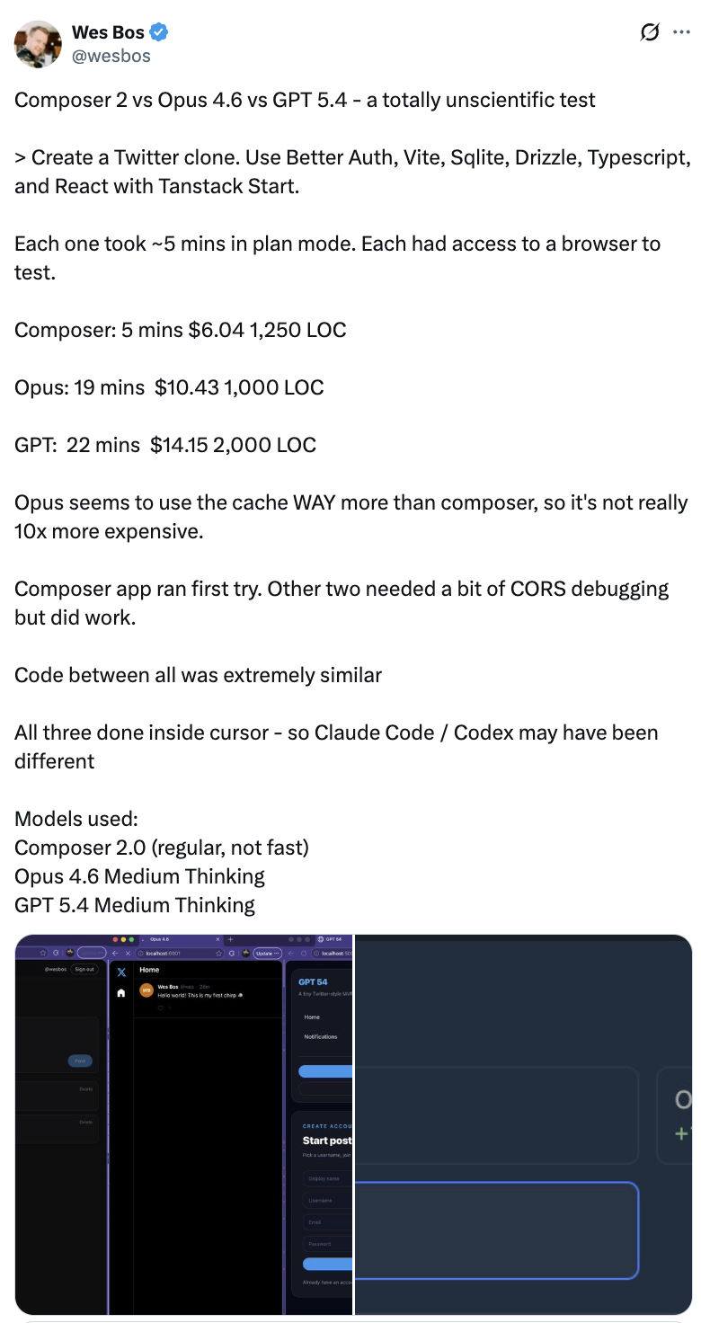 一位开发者网友对 Composer 2、Opus 4.6 和 GPT-5.4 在同一任务下做了波实测: