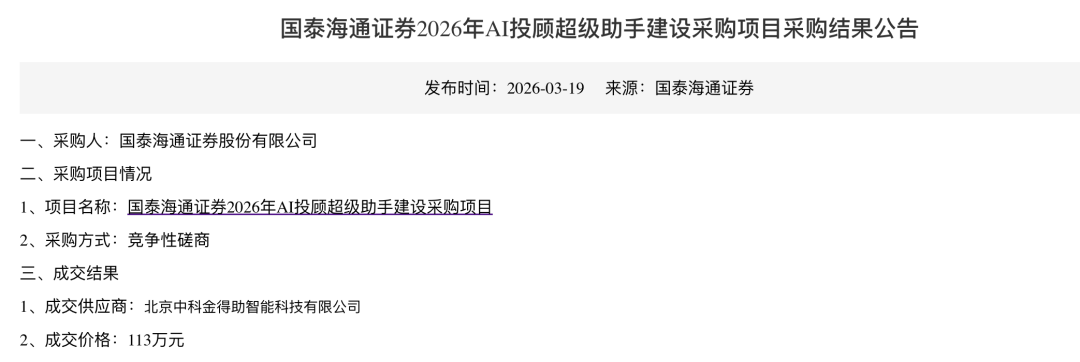 3月19日,国泰海通证券2026年AI投顾超级助手建设采购项目开标,北京中科金得助智能科技有限公司中标,金额113万元。