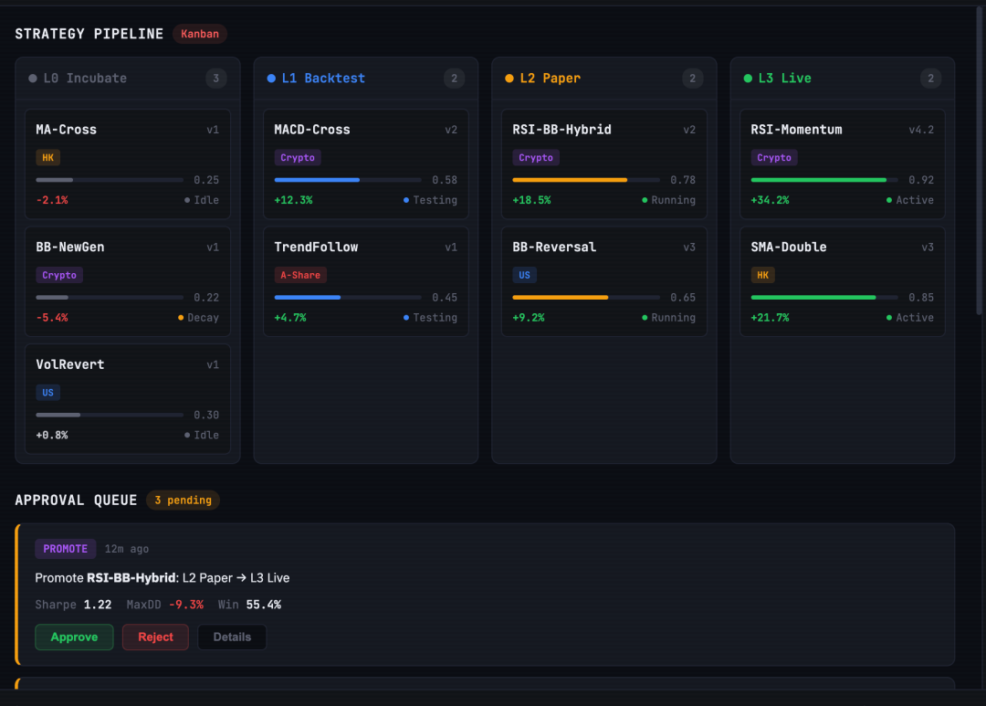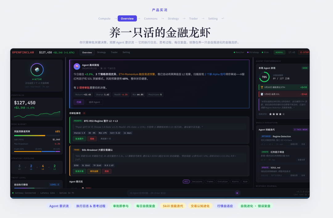 团队用一个更直观的比喻来解释这种变化——“养一只金融龙虾”。用户每天打开界面,不再只是看到行情或信息,而是看到 Agent 的工作状态:是在优化策略、生成报告,还是发现了新的交易信号;某个策略是否需要审批;系统当前处于怎样的运行阶段。用户的角色,也从执行者,变成了一个在管理系统的人。