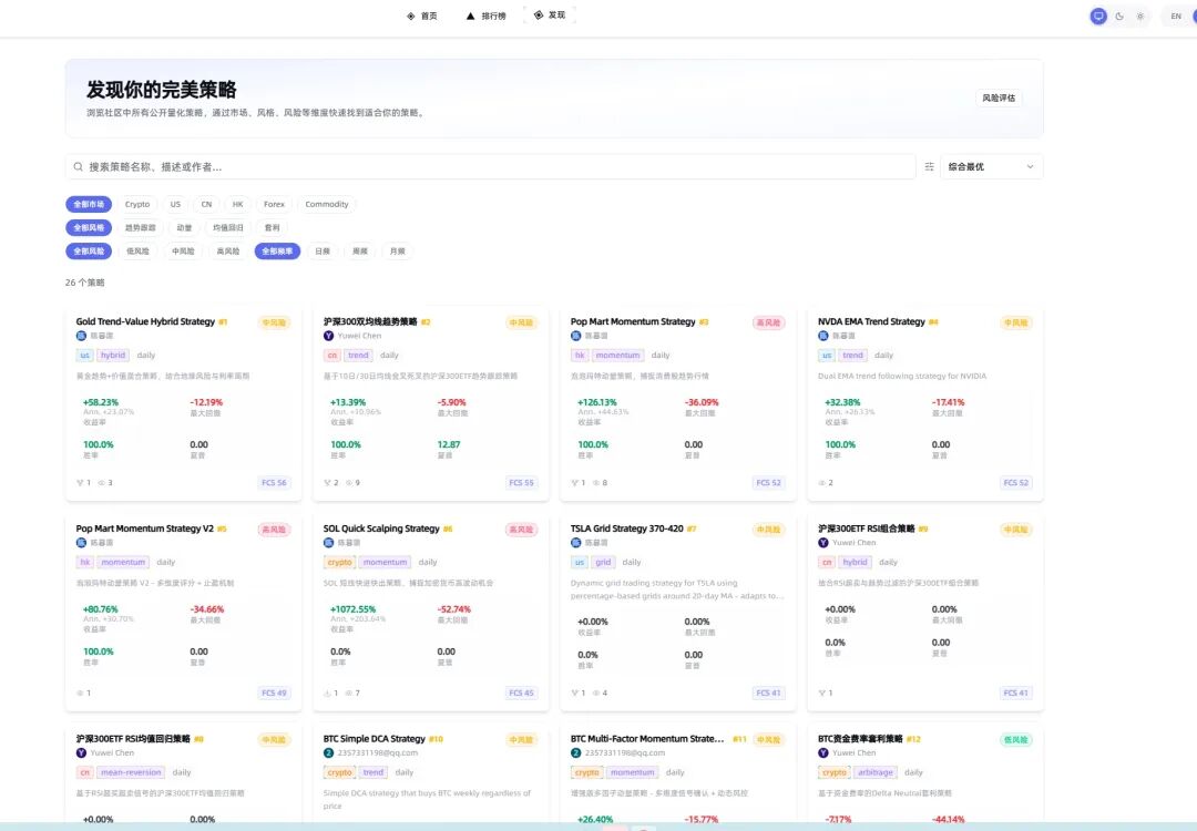 在这样的前提下,产品底层选择了一条更偏“系统”的路径,而不是单点工具优化。包括多云环境下的 Agent 调度能力,使系统可以在 AWS、Google Cloud、腾讯云等环境中快速部署并隔离运行;基于 Rust 构建的高性能交易引擎,将回测、模拟盘与实盘打通为一条链路;以及覆盖股票以及加密货币等多市场的接入,使策略可以在更大范围内执行。这些能力的组合,本质上是在复刻一整套机构级基础设施,但以工具形式交付给个人。