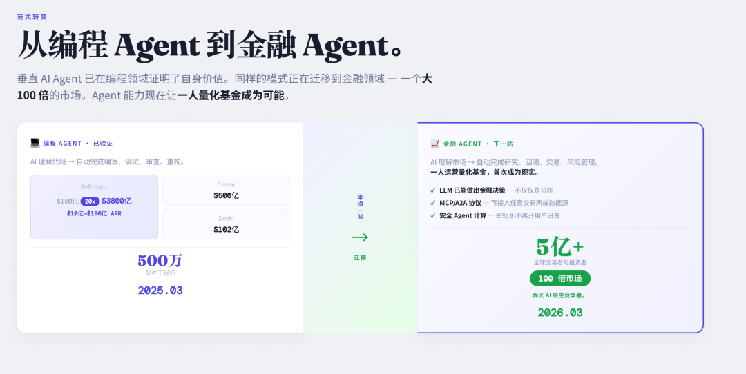 如果把视角再往外拉,会发现编程只是一个起点。更多行业还停留在“用 AI 提升一点效率”的阶段,而不是被整体重写。金融就是其中一个最典型的例子:一边是机构级团队用系统化能力处理市场,另一边是数亿个人投资者依赖碎片信息做决策,这种结构几十年没有变化。