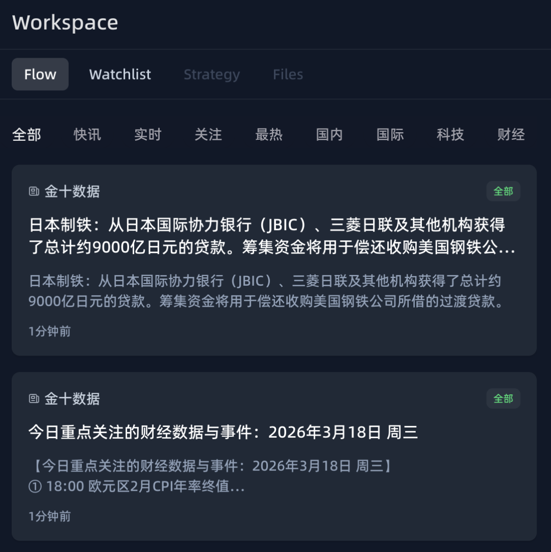 这得从它的前身 Findoo 开始说起。Findoo 是 xDAN 团队已经上线的金融专家 Agent,它的主页面展示了全球实时市场脉搏,不同市场的信息流同步滚动,来源覆盖主流财经媒体和 Twitter 实时讨论。用户不用再一个个来源手动刷新,信息自己就可以跑过来。