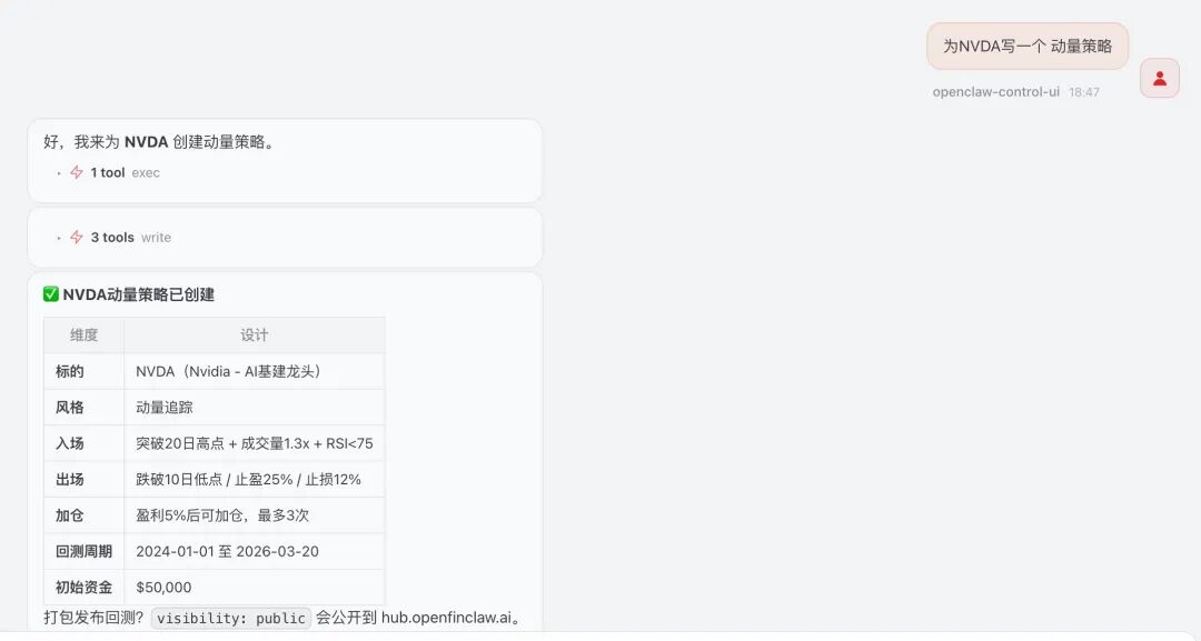 在这样的背景下,OpenFinClaw 将机构内部的一整套工作流程拆解,并通过 Agent 重新组合为一个系统。用户只需要输入一个判断,系统就会自动完成数据获取、策略生成、回测验证与执行路径设计,整个过程被压缩在几十秒内完成。