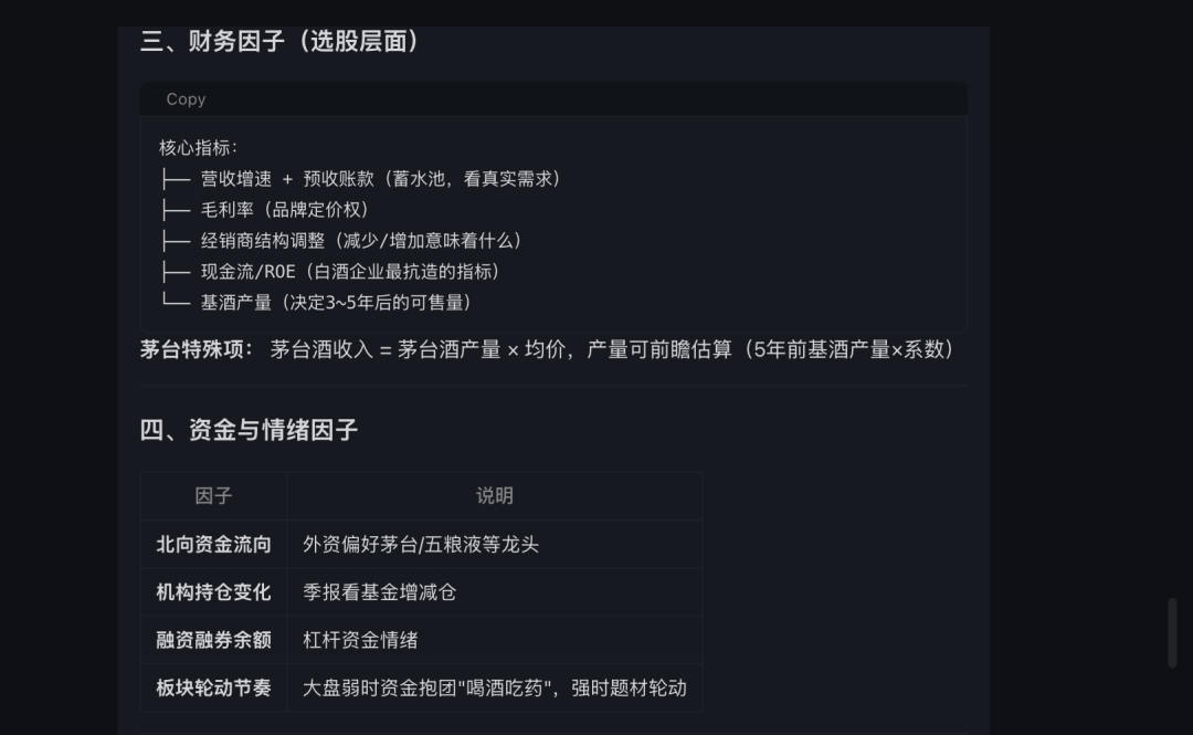 为了检测 OpenFinClaw 的上下文记忆,我们继续追问 OpenFinClaw 紧接着追问:“如果我想做一个基于白酒行业的策略,需要关注哪些因子?”