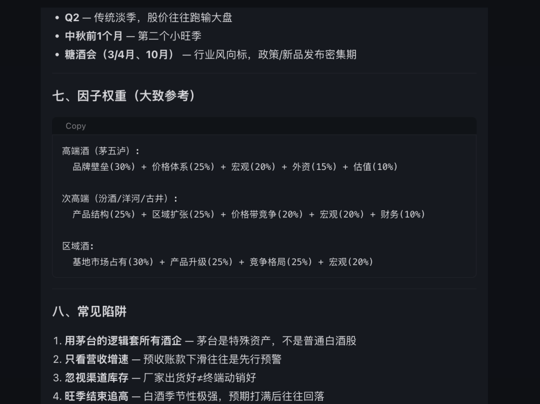 OpenFinClaw 不仅在连续对话中承接了茅台分析的逻辑,更列出了一份详实的白酒行业策略因子框架。最后,也不忘提醒投资者避免“用茅台逻辑套用所有酒企”、“忽视渠道库存”等常见错误。