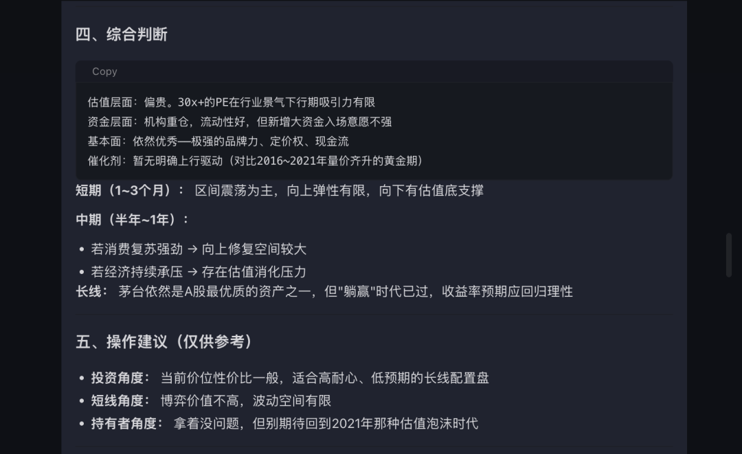 以白酒行业为例,我们让 OpenFinClaw 分析一下贵州茅台最近的走势,结合宏观环境和行业动态,给一个综合判断。