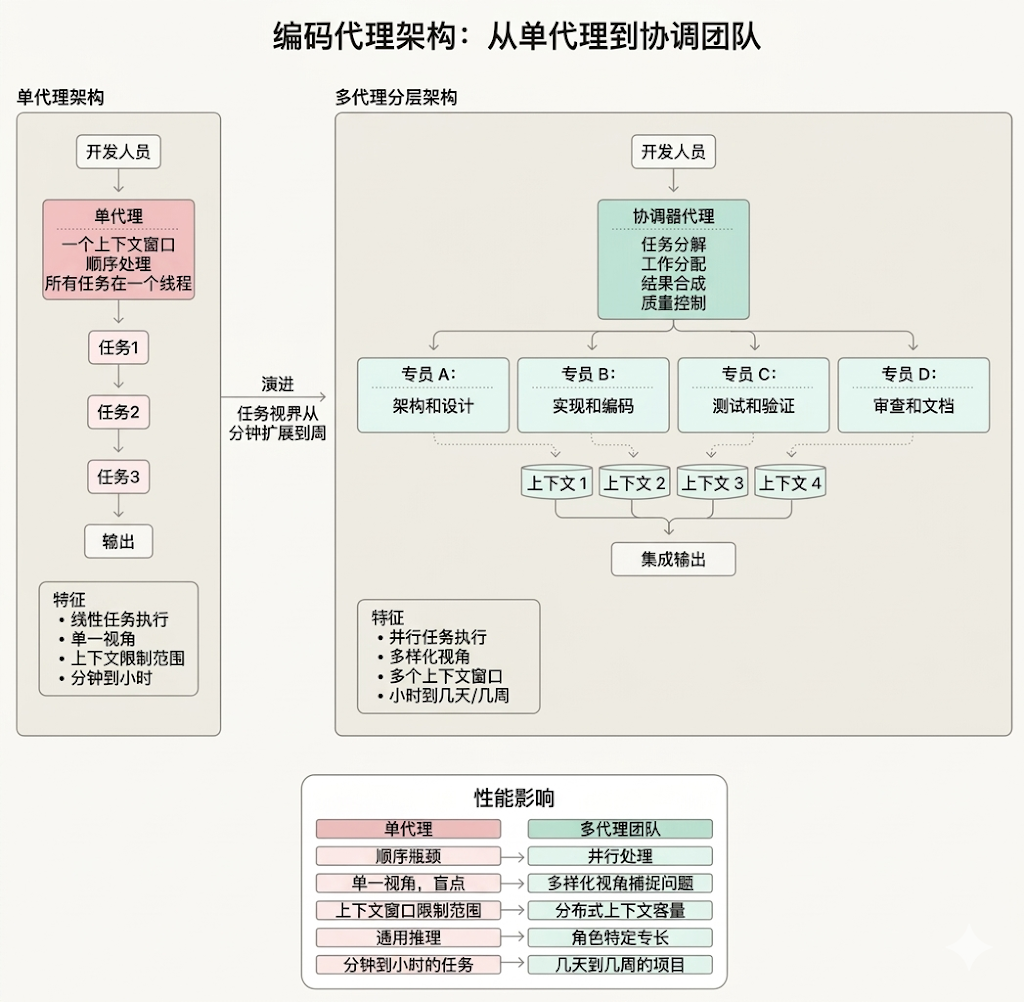 任务周期从几分钟扩展到几天或几周: 智能体从处理几分钟即可完成的离散任务,演变为能够长时间自主工作,构建和测试整个应用程序及系统,期间只需人类进行定期检查。