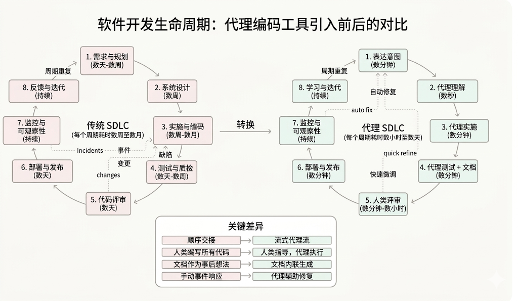 准备好迎接自图形用户界面(GUI)诞生以来,最震撼的一次人机交互革命了吗?如果说 2025 年,Agentic AI(代理式 AI)只是悄悄改变了部分程序员写代码的习惯;那么到了 2026 年,这种变化将引发一场海啸,彻底重塑整个软件开发生命周期(SDLC),并重新定义“软件工程师”这个职业。传统的开发阶段依然存在,但玩法全变了:由 AI 智能体驱动的代码实施、自动化测试和文档编写,将原本动辄数周的开发周期,粗暴地压缩到了短短几个小时! 监控数据实时反馈,产品迭代快得像按下了快进键。报告给出了三个极其刺眼的预测: