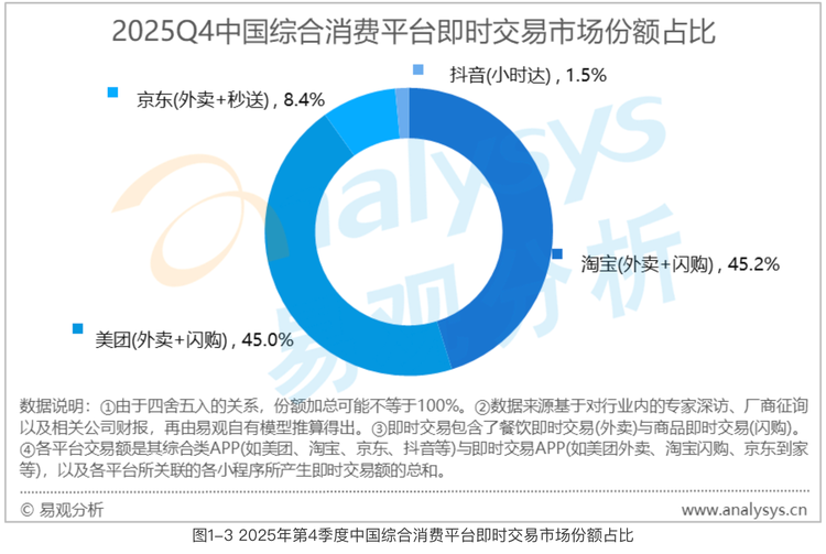 尤其是市场贡献,易观数据显示,2025年第四季度淘宝闪购以45.2%的市场贡献,以0.2个百分点的微弱优势领先美团的45.0%。这个“双寡头”席位,阿里确实砸钱抢到了。