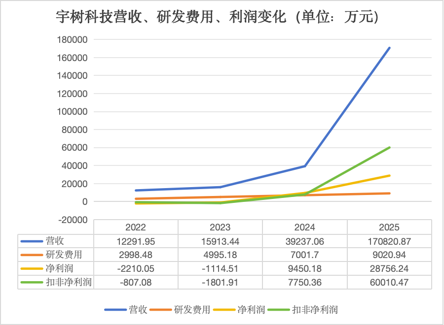 先看营收。2022 年,宇树营业收入还只有 1.23 亿元,2023 年增至 1.59 亿元,2024 年进一步升至 3.92 亿元,而 2025 年全年经审阅收入达到 17.08 亿元。仅 2025 年前 9 个月,公司收入就已达到 11.67 亿元,远超 2024 年全年。