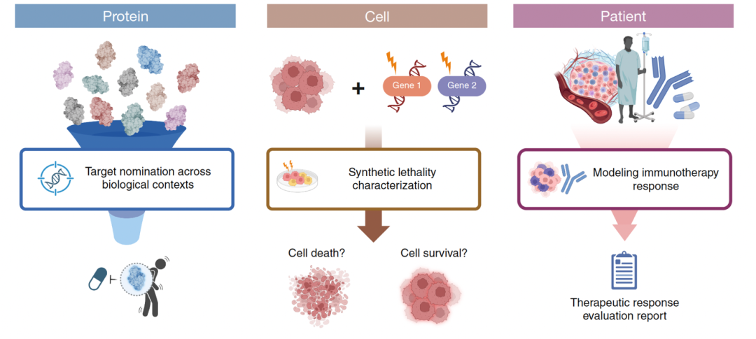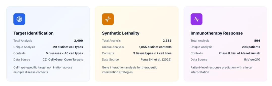 MEDEA 在三个开放式治疗发现任务上跑了 5,679 次完整组学分析,覆盖精准靶点发现(2,400 次,涵盖 5 种疾病,29 个细胞类型)、合成致死推理(2,385 次,7 个癌细胞系)、以及患者级别的免疫治疗响应预测(894 次,298 名膀胱癌患者)。