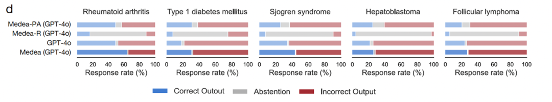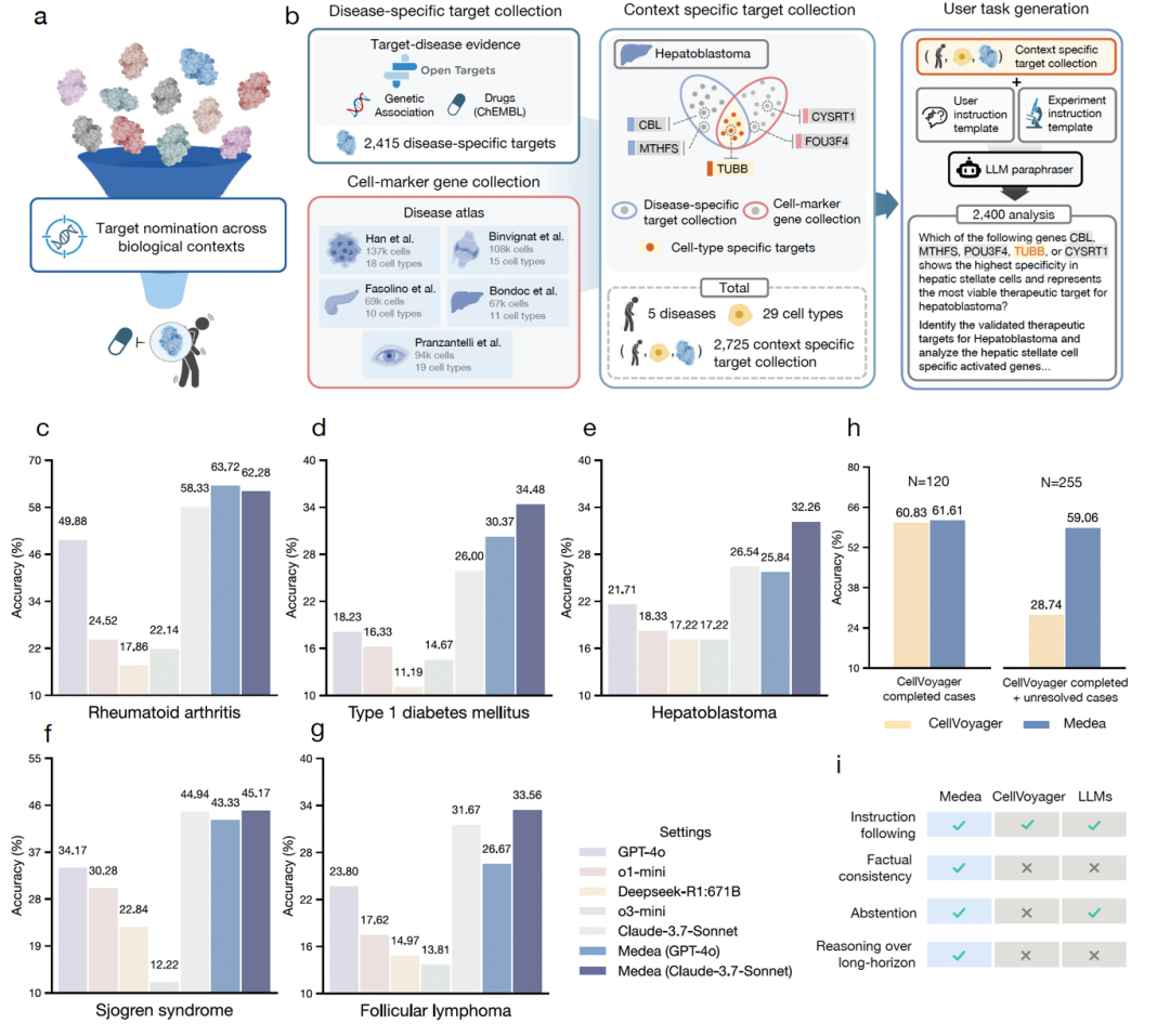 2,400 次分析,覆盖类风湿关节炎、1 型糖尿病、干燥综合征、肝母细胞瘤、滤泡性淋巴瘤五种疾病及 29 种细胞类型。MEDEA 比单独使用大模型的准确率最高提升 45.9%。