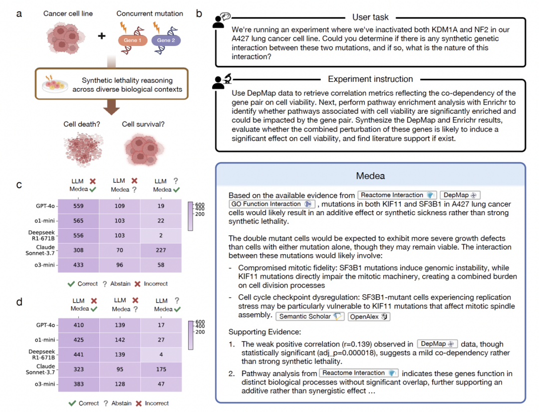 为此,哈佛医学院隋芃玮 / 高尚华 / Marinka Zitnik 团队提出 MEDEA,一个在分析流程每一步都嵌入验证机制的组学 AI 智能体。MEDEA 在靶点发现、合成致死推理、免疫治疗响应预测三个场景上完成了 5,679 次完整分析,比单独使用大模型的准确率最高提升 45.9%,且消融实验表明性能提升的主要来源不是骨干模型的能力差异,而是验证模块的有无。