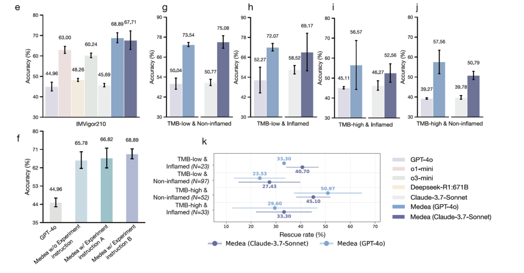 894 次患者级别分析,基于 IMvigor210 膀胱癌队列的 298 名患者。MEDEA 比大模型最高提升 23.9%。在高肿瘤突变负荷且非炎症型微环境这一最困难的亚组中,MEDEA 修正了底层机器学习模型 50.9% 的误分类。