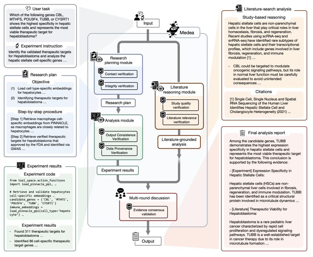 MEDEA 接受自然语言描述的研究目标,使用 20 个专业工具执行多步分析,核心设计原则是在流程每一步嵌入验证,而非仅在最终输出时判断对错。