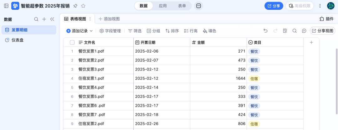 使用这个发票相关的技能,我再次略微调整提示词,使用标准模型,这次3分钟左右就生成了表格,然后使用AI钉钉表格的“仪表盘”功能,直接实现了数据可视化。这次消耗了22.7算粒。相比前两次,结果更好,速度更快,而且成本大幅降低。