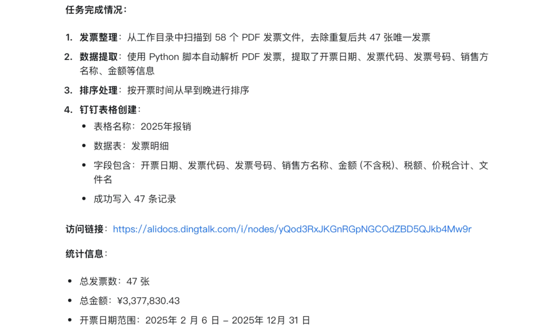 整理和分析发票是企业级的常见工作场景。我也让“悟空”去尝试去做了这项工作。在这次任务的体验中,我的感受也非常多。