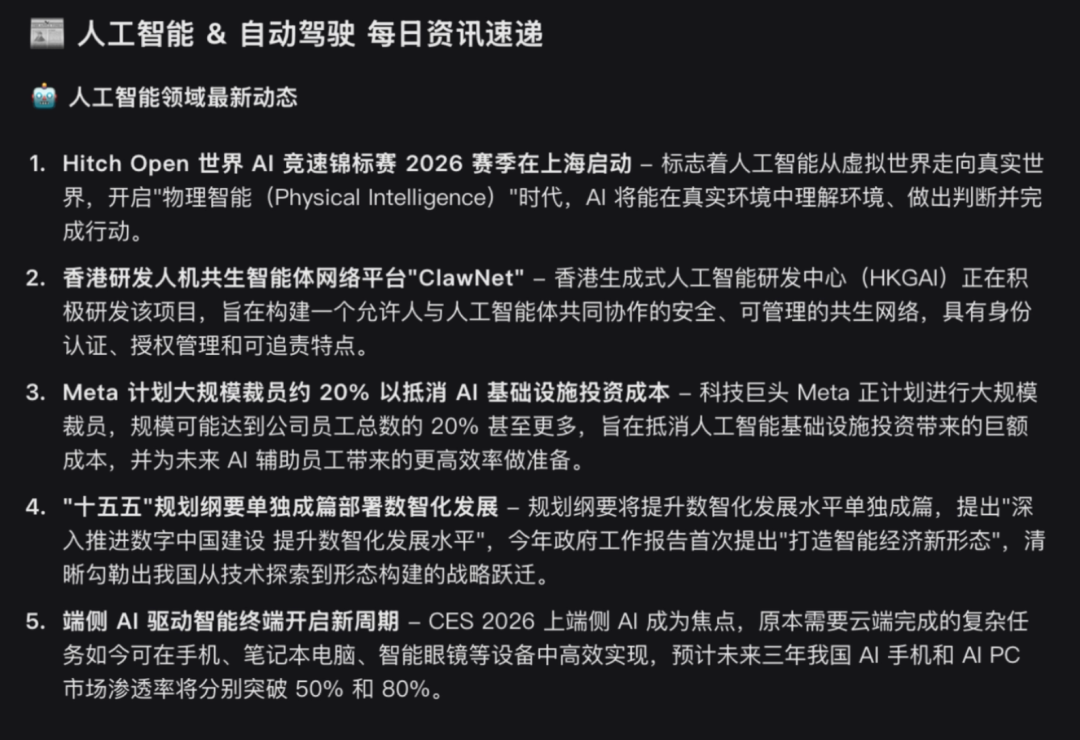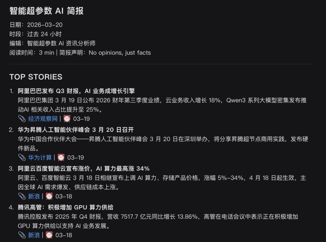 上面这张截图,是在新的提示词之后,“悟空”生成的一份简报,内容质量非常高。这直接节省了我每天一早去各大网站查看AI资讯的时间。