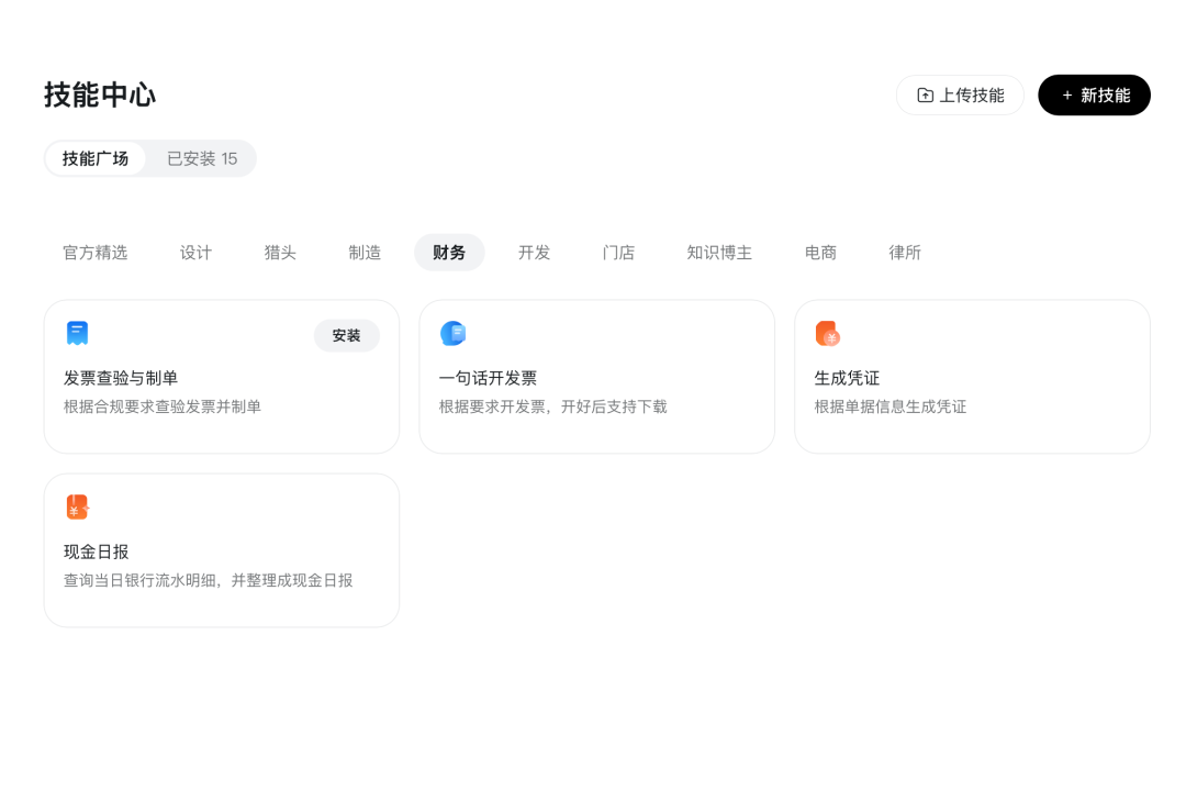 很快,我进行了第三次尝试,这次正好赶上“悟空”新版本升级。升级之后,技能中心出现了“发票检验与制单”功能。