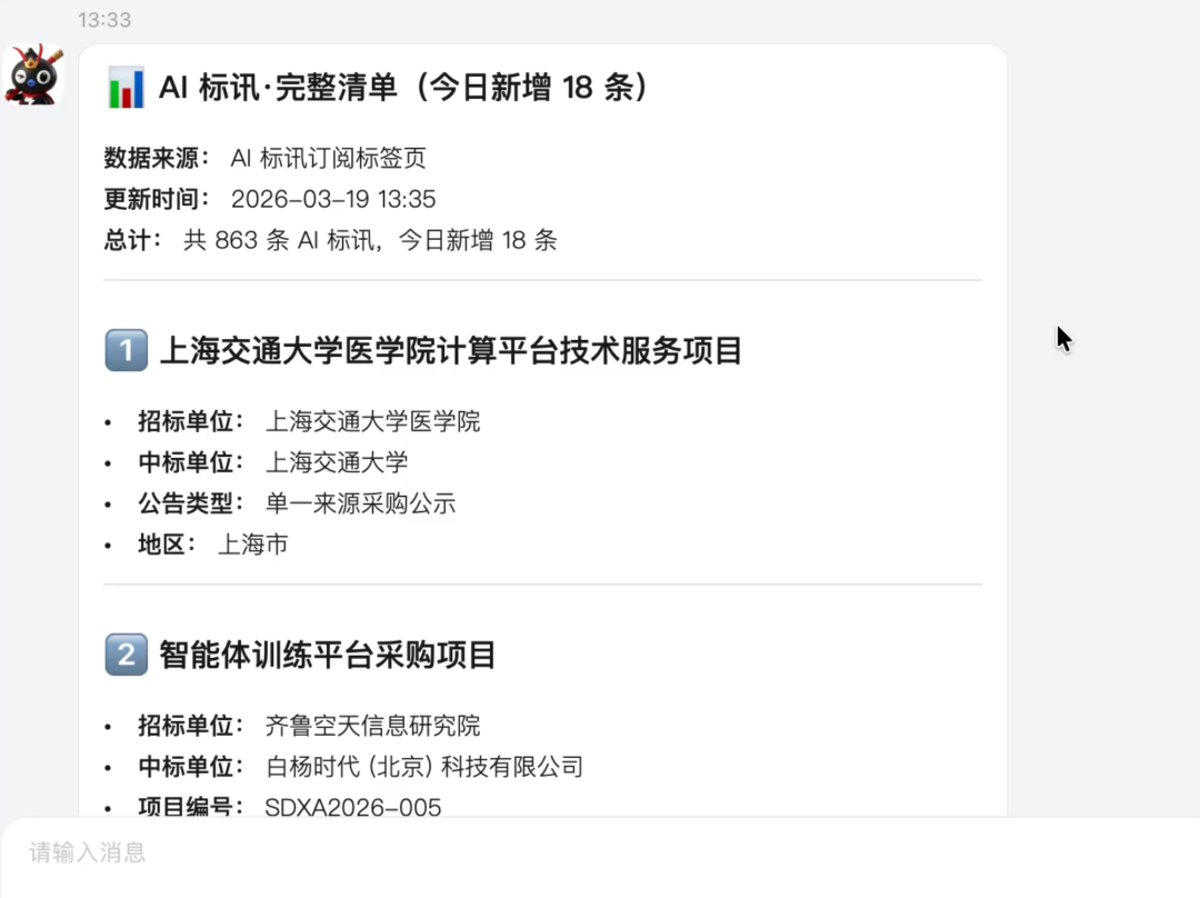 过去几天,在工作的时候,我让“悟空”自己每隔30分钟去监控一次每日新增标讯,写入AI钉钉表格,把新增标讯的核心信息在钉钉上通知我。如果有重要标讯,我再打开网站去查看更为详尽信息,并且判断是否在公众号上发布。