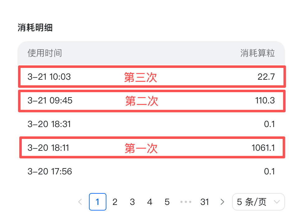 这就是三次“悟空”执行整理发票任务进行的时间和算粒消耗,消费记录明明白白。