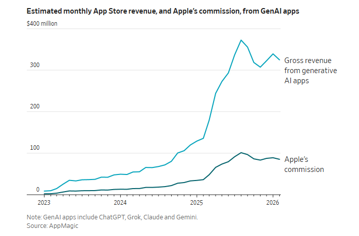 2025年,亚马逊、Alphabet、Meta、微软四家公司在AI基础设施上砸下近7000亿美元,摩根士丹利预测亚马逊的自由现金流将因此转负。同一年,苹果几乎没有在大模型上花什么钱,却从生成式AI应用中收取了近9亿美元佣金。根据分析公司AppMagic的数据,今年这个数字预计突破10亿美元。
