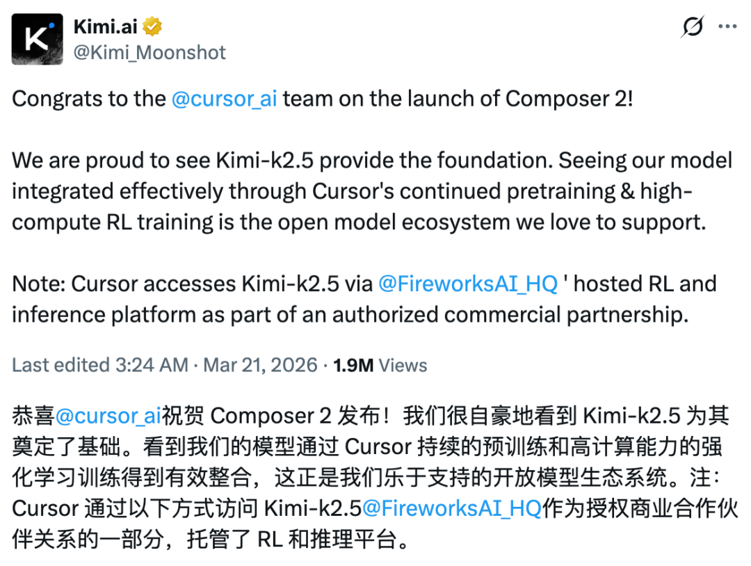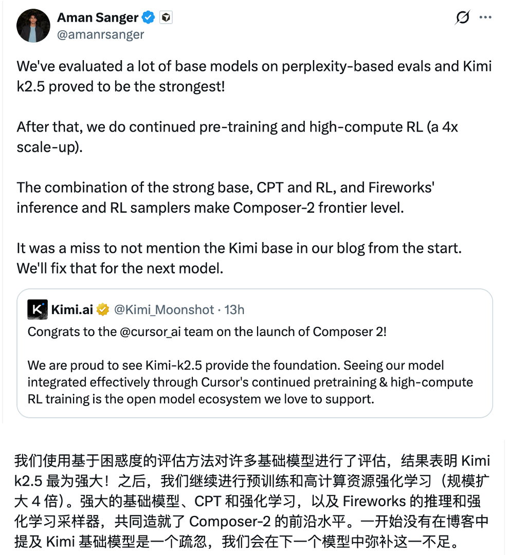 随着风波闹大,Cursor 方面开始紧急补救。高管 Lee Robinson 公开承认未提及 Kimi 是“工作疏漏”,月之暗面官方也顺势发文祝贺,落落大方地写道:“We are proud to see Kimi-k2.5 provide the foundation.”