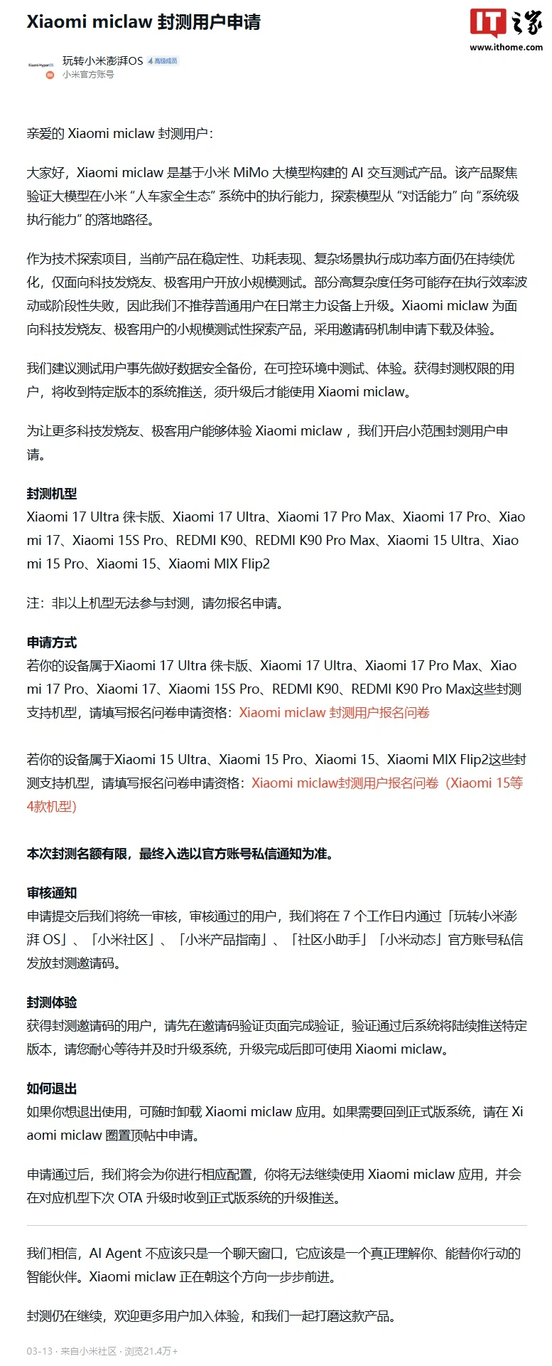 3 月 22 日消息,据小米官方账号“玩转小米澎湃 OS”在小米社区发布的最新信息,官方“龙虾”Xiaomi miclaw 封测