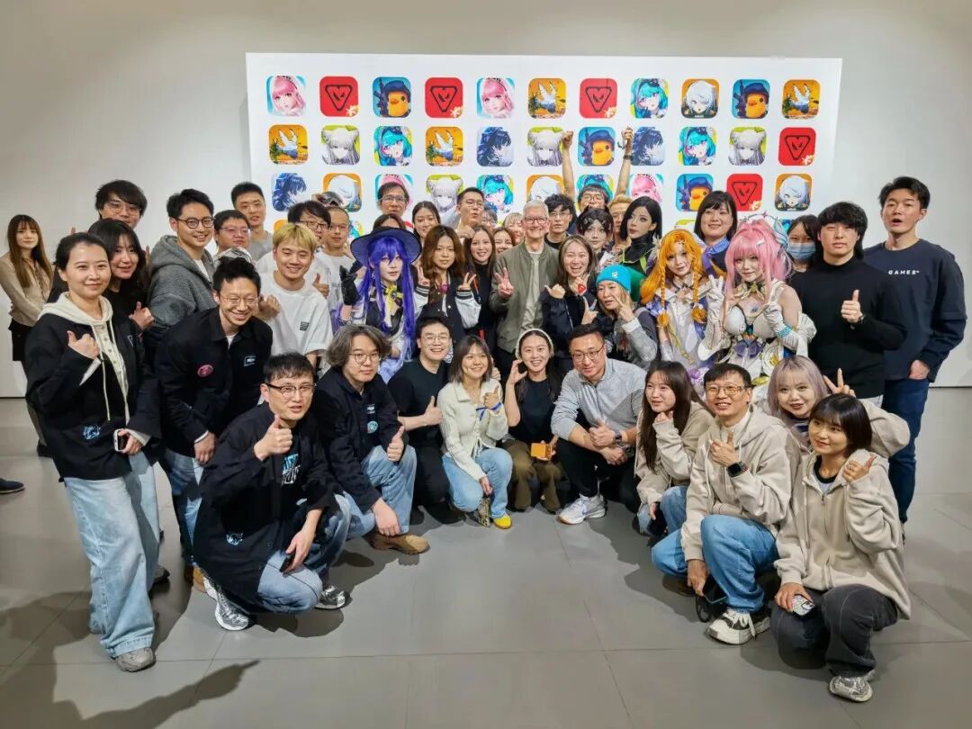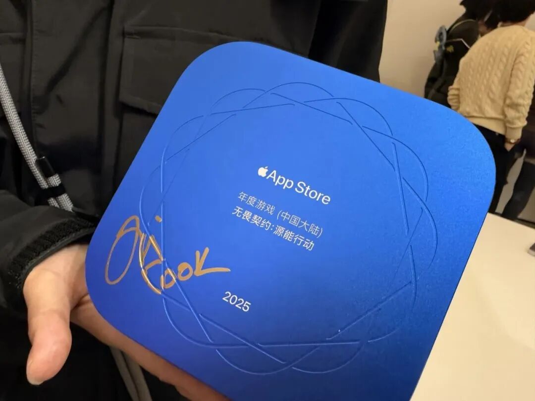 交流期间,库克看到了展台上的蓝色方形荣誉奖杯,这是《无畏契约手游》拿下2025年度游戏的证明。库克对团队取得这项荣誉表达了祝贺,并亲自在奖杯上留下了签名,也与团队成员们合了影。