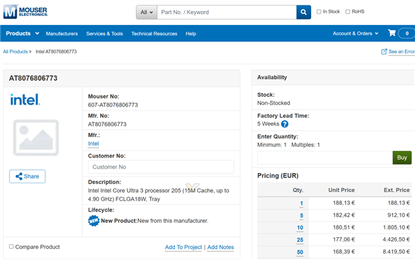 Intel入门酷睿Ultra 3 205现身零售商:8核8线程、要价近1300元