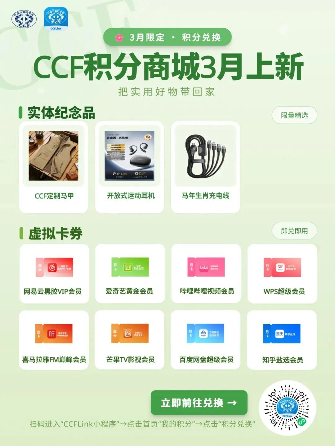 这些积分能做什么?答案就在你的CCF积分账户里——兑换3月新上线的“踏春马甲”,让你在这个春天,穿上CCF的专属温暖,踏青、参会、活动,处处都是会员的标识。