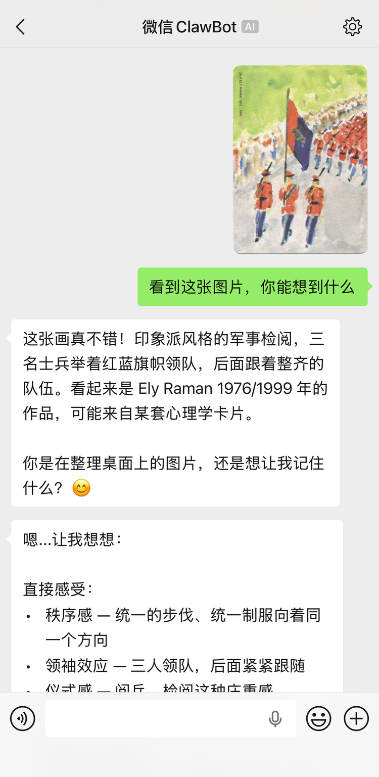 但有一点需要注意,微信不支持图文混合输入,只能逐条发送。所以当你发送图片或文件后,龙虾会立即开始处理,不会等你再补充说明。