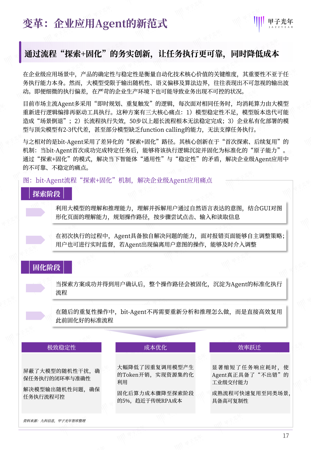 首创“探索+固化”务实创新机制:针对大模型输出的随机性与超长流程执行易出错的问题,bit-Agent设计了差异化的流程“探索+固化”机制,即在初次面对任务时利用大模型进行自主“探索”与路径规划,在成功并经用户确认后,便将该路径沉淀“固化”为标准化的原子能力。这一机制完美平衡了Agent的通用智能与企业级应用需求的稳定性,同时将后续重复任务执行的算力成本大幅降低。