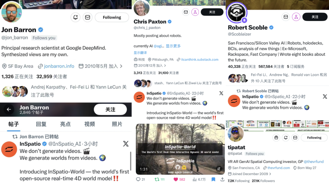 项目发布后迅速引发硅谷 AI 圈层关注,多位意见领袖相继转发;NeRF 原始论文共同作者、Google DeepMind 首席研究科学家 Jon Barron 也在第一时间参与传播。