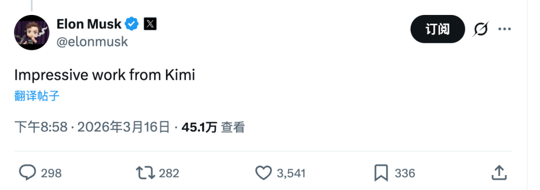 Cursor 事件引爆当天,马斯克在 X 上转发并评论。这是他一周内第二次公开提及 Kimi。