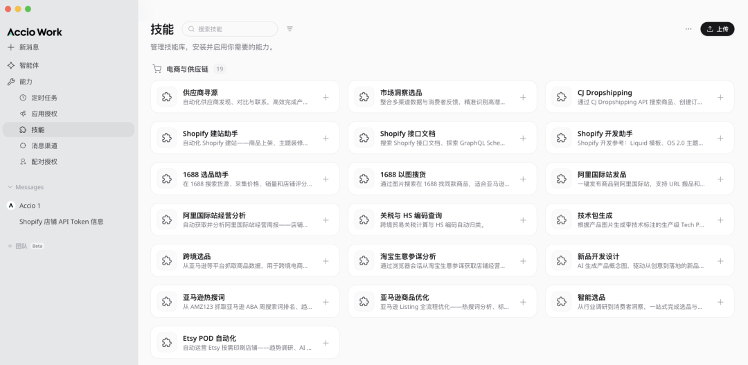 而为了在海外跑通这条链路,Accio Work 内置了一套技能库。电商与供应链方向 19 个 skill,包括供应商寻源、市场洞察选品、1688 选品助手、1688 以图搜货、关税与 HS 编码查询、Shopify 建站助手、跨境选品、亚马逊热搜词、亚马逊商品优化等