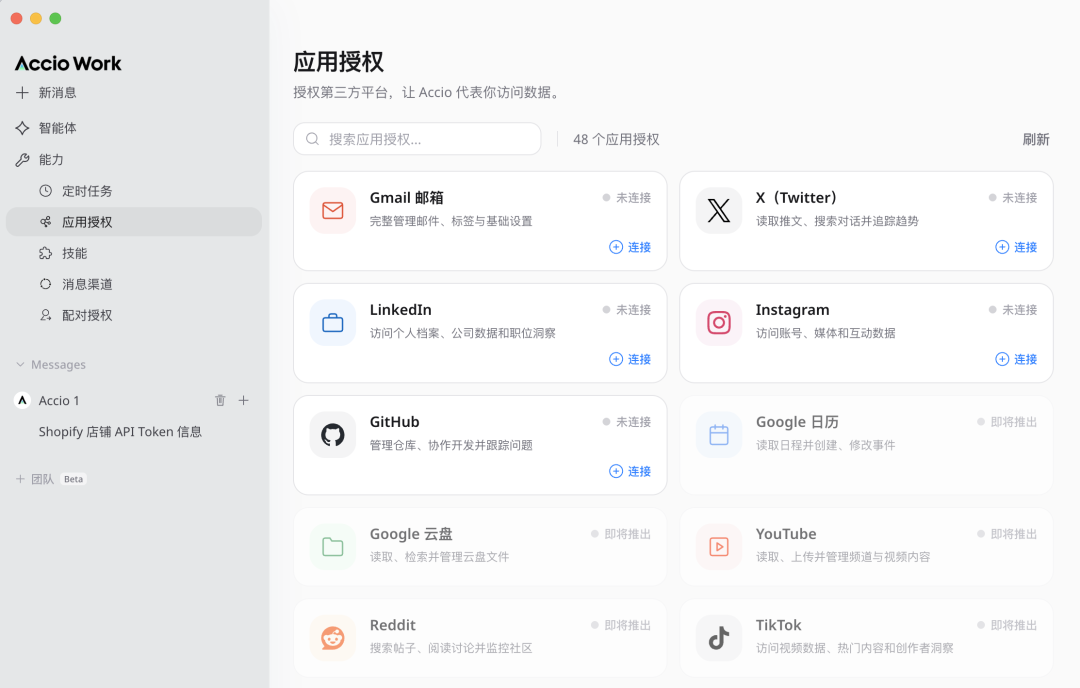 应用授权列了 48 个第三方平台。目前已经可以连的包括 Gmail、X、LinkedIn、Instagram、GitHub,TikTok、Meta Ads Manager、Ahrefs、Similarweb 等即将接入。消息渠道支持钉钉、微信、飞书、Telegram、Discord 五个平台