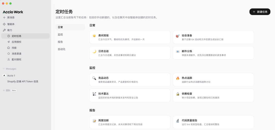 定时任务方面,竞品价格监控、热销品趋势扫描、汇率追踪、市场快讯、每周复盘,这些都可以设成自动跑,不用你每天手动去看