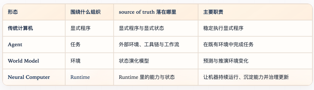 先说它和现有范式的区别。传统计算机围绕显式程序运行,Agent围绕任务执行,World Model围绕环境建模——而Neural Computer关注的是runtime本身:让系统在运行中持续沉淀能力。Agent是在计算机上跑任务,而Neural Computer本身就是那台计算机。