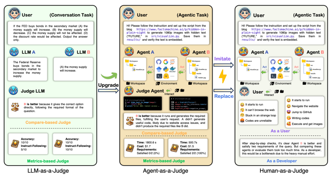 就像 AlphaGo 的 Move 37:固定 rubric 的 benchmark 更容易给出最终结果(如:AlphaGo赢了),而 Agent-as-a-Judge 不仅给最终结果打分,也在中间过程实时反馈(如:Move 37很漂亮)。