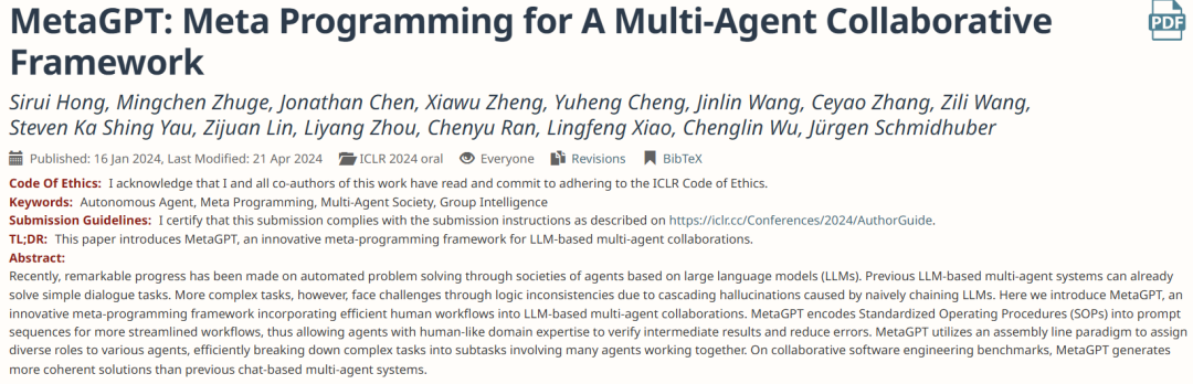 最开始ChatGPT 只能写20到100行代码,而且你可能还得自己去编译、去修改。并且一开始基础模型的context window只有2k到4k,也就是远远不够用来理解一个repo级别的代码的。但那时候我就觉得 Agent 在这个领域能够产生非常大的价值。作为研究课题,当时也有足够多低垂果实。比如ICLR 2024的Oral Papers,关于Coding Agents的唯二工作,一篇是MetaGPT,另一篇是SWE-Bench,在后面的影响力都挺大的。