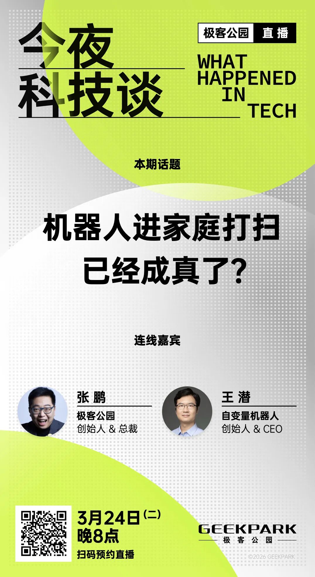 今晚 20:00,极客公园视频号直播间,极客公园创始人 & 总裁张鹏对谈自变量机器人创始人 & CEO 王潜,一起聊聊今年机器人领域该关注些什么?
